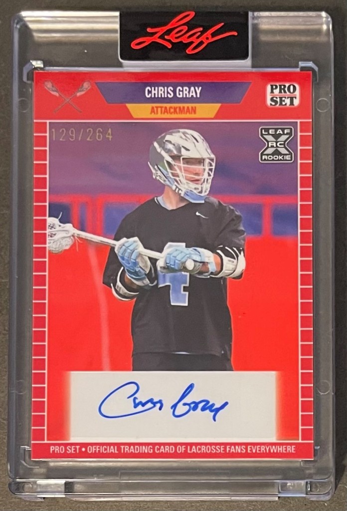 In recent years, Leaf has made its niche in the hobby by offering both licensed and unlicensed products, as well as a combination of flagship-style sets and print-on-demand single card offerings. The company’s previous lacrosse card experience is basically two POD cards of high school players and a series of Chris Gray cards that were issued several different ways in 2023.